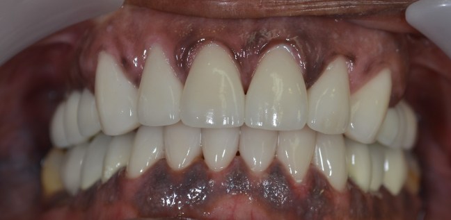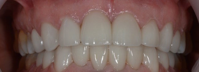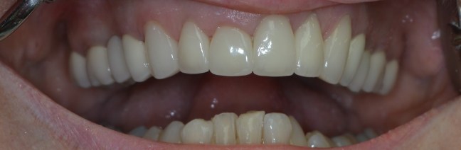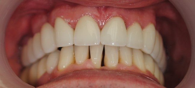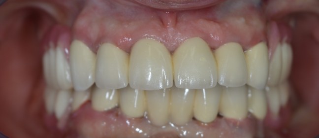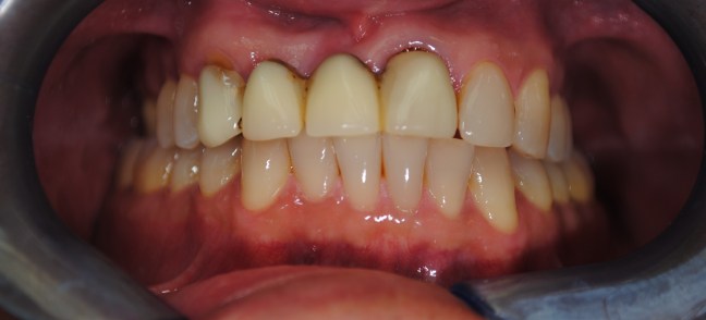 Funkcionális és esztétikai kezelés: harapás korrigálása a fogív kiegyenesítése, fogak közötti rések szűkítése, kereszt harapás megszüntetése az összes megmaradt fog koronázásával. A hiányzó hátsó fogak pótlása implantátumokon megtámasztott koronákkal.