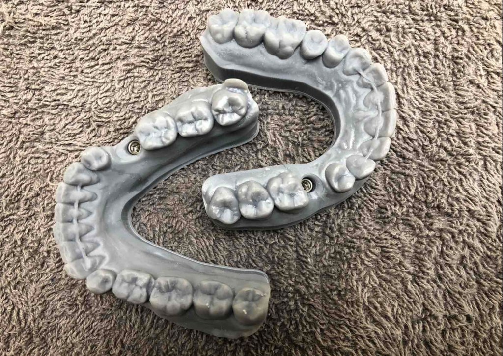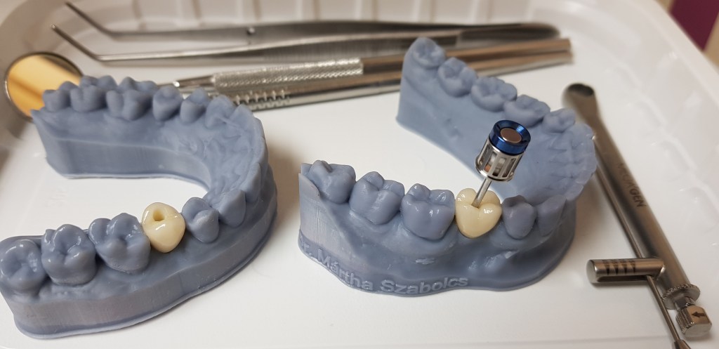 A megtervezett koronák tetszőleges fogszínű porcelánnal történő borításához 3D nyomtatóval készülnek a fogívek valósághű másolatai.